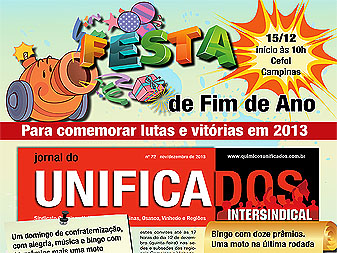 Jornal Especial do Unificados sobre a Festa de Fim de Ano de 2013 no Centro de Formação e Lazer (Cefol) das regionais Campinas/Vinhedo e Osasco. Quatro rodadas de bingo com 12 prêmios, atrações especiais, música ao vivo com a Banda Luxus, passeios a cavalo, convidados… Relembre também as principais ações nas fábricas da categoria e junto aos movimentos sociais e populares da Regional Campinas do Sindicato Químicos Unificados. Também a vitória contra a Shell/Basf e ação coletiva pelo FGTS.