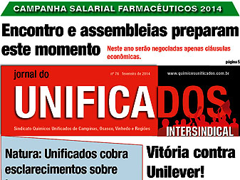 Encontro de base e assembleia dia 23 de fevereiro (domingo) pela manhã abrirão a campanha salarial 2014 do setor farmacêutico, no Cefol das regionais Campinas/Vinhedo e Osasco. Vitória contra a Unilever, em Vinhedo: TST decide a favor dos trabalhadores no processo sobre alcoólicos. Ministério do Trabalho: Unificados cobra informações sobre jornada e PLR na Natura, em Cajamar. Unificados tem sete companheiros(as) eleitos para direção da Fetquim. Regional Vinhedo do Unificados completou 50 anos.