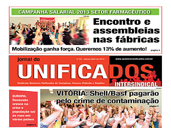 Campanha salarial 2013 ganha força com assembleias nas fábricas e encontro de base dia 24 de março veja fotos. Shell e Basf pagarão pelo crime de contaminação em Paulínia./SP. Trabalhador morre na Galvani, em Paulínia. Dia Internacional da Mulher a manifestação em Campinas. Na entrevista, Vinícius Zanotti, jornalista que atuou no Unificados, fala sobre seu projeto Escola de Bambu na Libéria. Na Europa, recessão aumenta na crise econômica e população vai às ruas em diversos países.