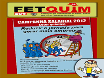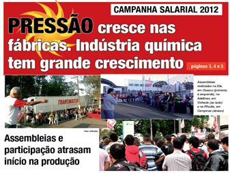 Pressão cresce nas fábricas, com assembleias e atrasos no início da produção, nas mobilizações da campanha salarial 2012 do ramo químico. Indústria química tem grande crescimento. Na Europa, população vai às ruas contra aumento de impostos e cortes em serviços sociais em razão da crise econômica. A armadilha do empréstimo consignado. Veja fotos da Festa das Crianças do Sindicato Químicos Unificados, no Cefol das regionais Campinas/Vinhedo e no de Osasco.