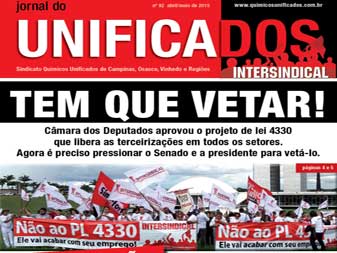 Câmara dos Deputados aprovou projeto de lei 4330, que libera a terceirização em todos os setores das empresas. Agora é preciso pressionar o Senado e a presidente Dilma para que ele seja vetado. Campanha Salarial 2015 Farmacêuticos: Proposta é aprovada como patamar mínimo e luta nas fábricas deve continuar por reivindicações específicas. O VI Congresso dos Químicos Unificados. No 1º de Maio, nenhum direito a menos. Festa da Juventude e da Retomada do Sindicato, no Cefol Campinas.