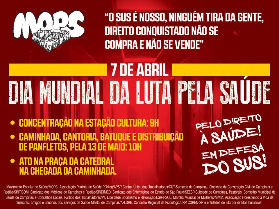 O Movimento Popular de Saúde de Campinas – MOPS junto à diversas outras entidades de Campinas estará promovendo amanhã, dia 7, Dia Mundial da Luta pela Saúde, um ato em defesa do SUS e pelo Direito à Saude. O Unificados entende que a saúde é um direito de todos e dever do estado. Portanto, esta é uma luta de […]