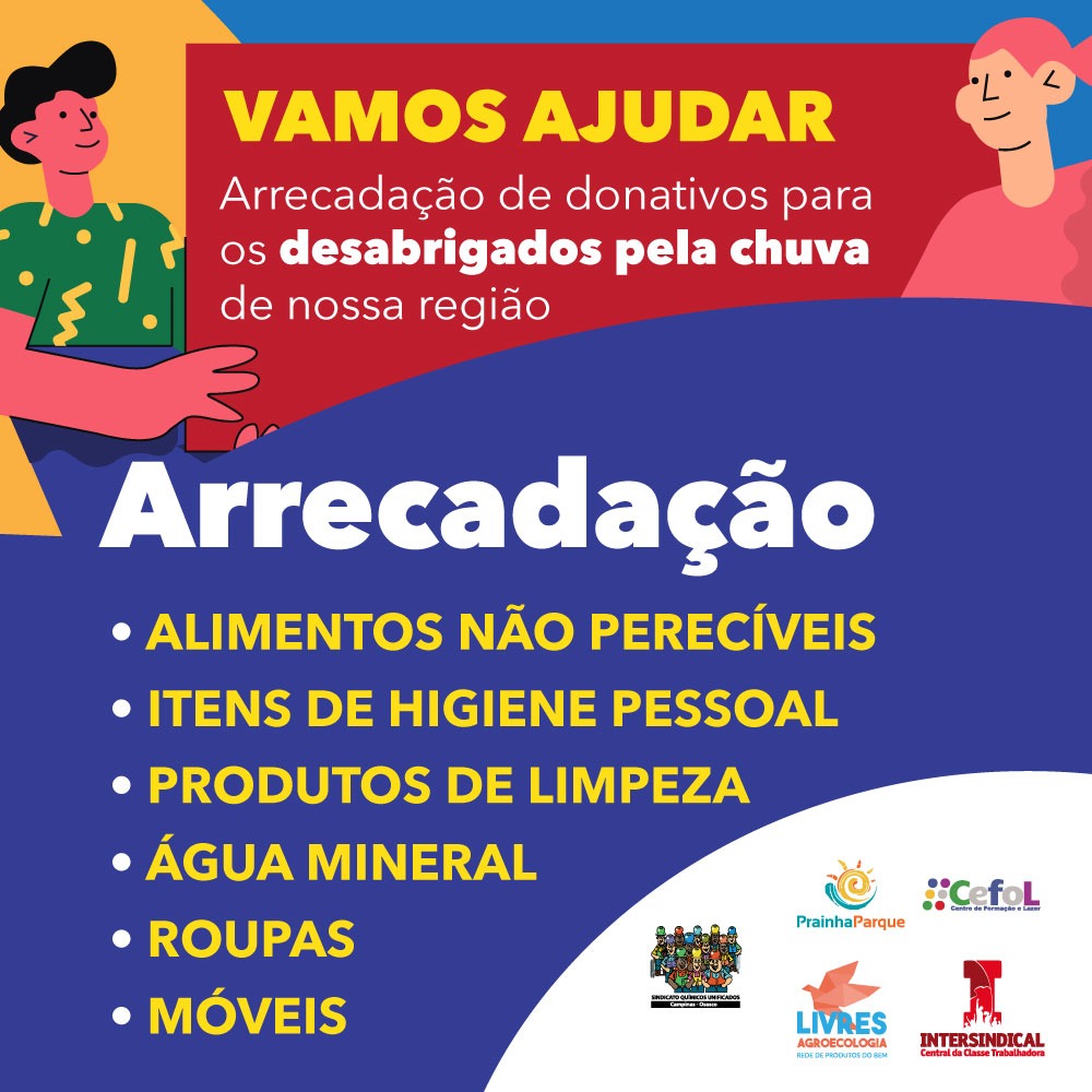 De acordo com o governo estadual, cerca de 1.500 famílias estão desalojadas em decorrência das fortes chuvas em São Paulo. Precisamos de vocês para fazer a diferença na vida das pessoas que foram afetadas por essa fatalidade, em sua grande maioria trabalhadores e trabalhadoras. Por isso, o Sindicato Químicos Unificados (Campinas e Osasco), Cefol Campinas […]