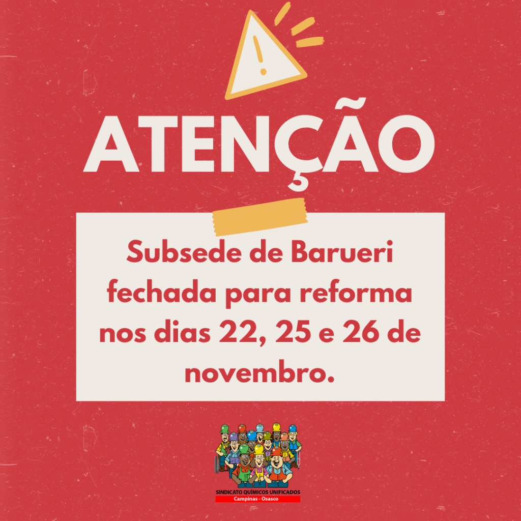 Nos dias 22, 25 e 26 de novembro, a subdesde de Barueri estará fechada para reforma. Caso tenha alguma dúvida, entre em contado com a sede de Osasco: (11) 3608 – 5411