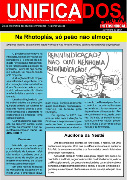 O problema não é novo na Rhotoplás, há mais de 10 anos trabalhadores e a direção do Sindicato reivindicam o fornecimento de refeição para o pessoal da produção. Porém, até hoje nenhuma solução foi providenciada.